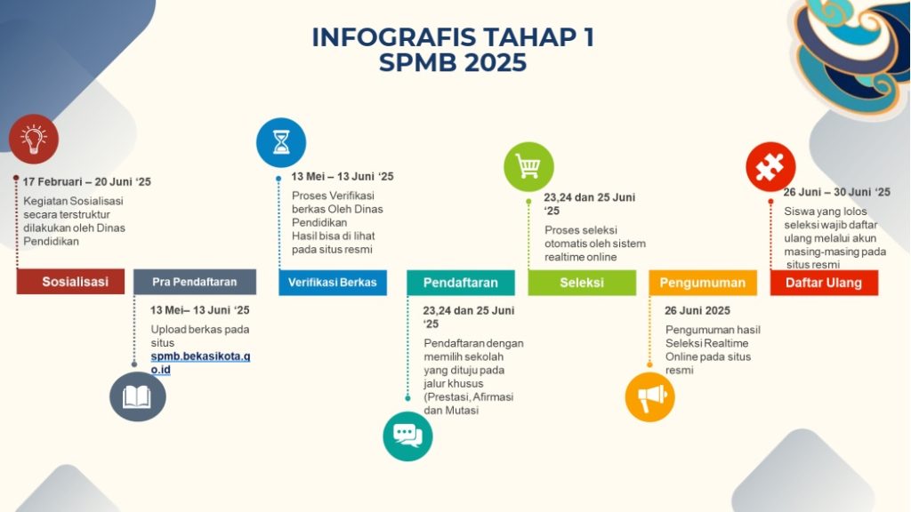 3. Pengumuman Hasil Seleksi pendaftaran tahap 1, dilaksanakan pada tanggal 26 Juni 2025. Daftar Calon Peserta Didik yang diterima dapat dilihat pada https://spmb.bekasikota.go.id